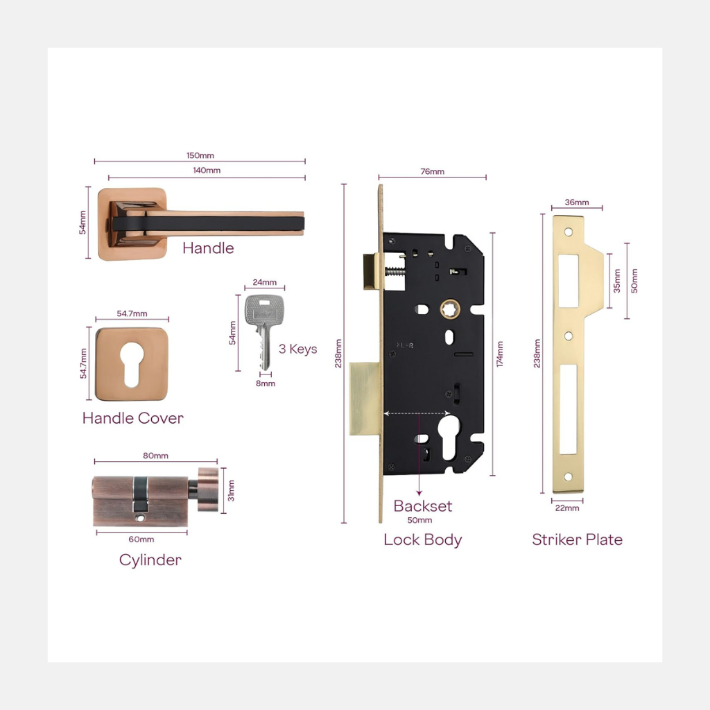 | Included Components | 1 x Rosette Handle, 1 x Lockbody, 1 x Cylinder, 1 x Europrofile Rose, 1 x Striker Plate, 3 x Brass Keys1 x Rosette Handle, 1 x Lockbody, 1 x Cylinder, 1 x Europrofile Rose, 1 x Striker Plate, 3 x Brass Keys |